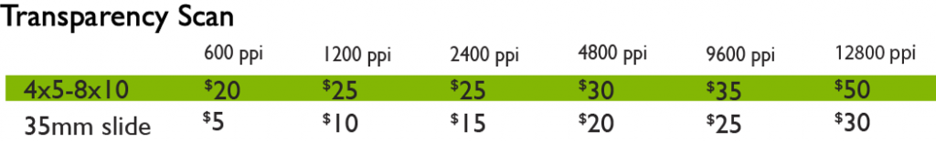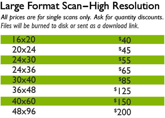 We offer a variety of effective scanning solutions! Our unique large-format scanning technology sets us apart and allows us to scan very large works of art with enormous accuracy and in high definition. We also specialize in photo and transparency scans. Have a pile of old photos that you want to digitize and protect? We can help!